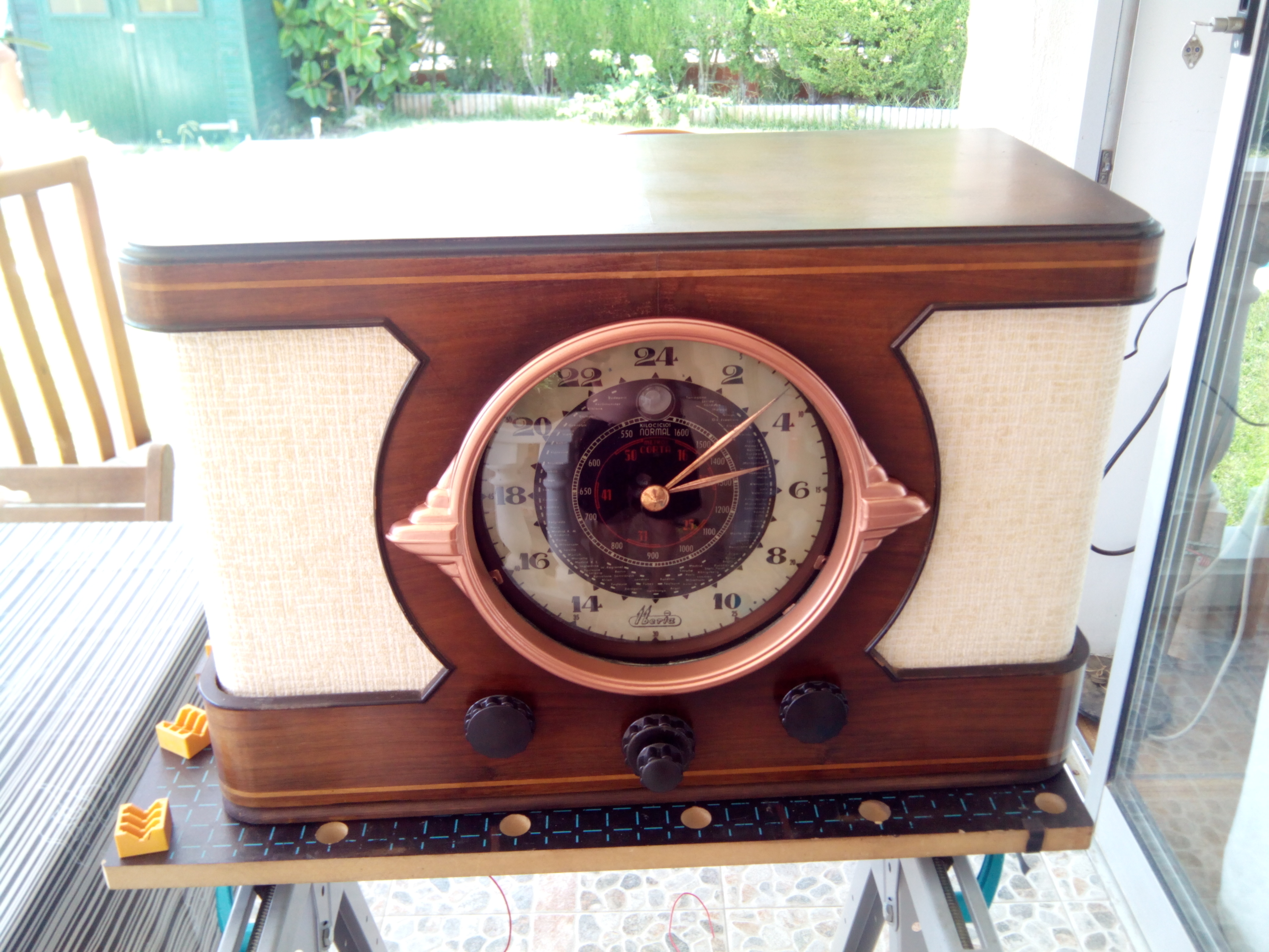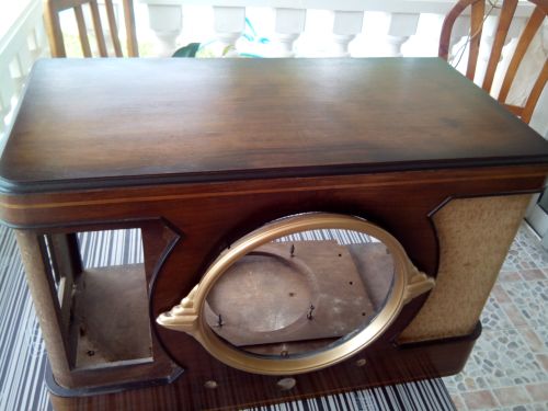 Como ya expuse mas arriba es una lástima que no tengo fotos del mueble tal y como vino. El caso es que la tela del lado altavoz estaba completamente rota, la parte superior del mueble con rayas, una especie de alquitrán y roales de algun vaso o macetita. |